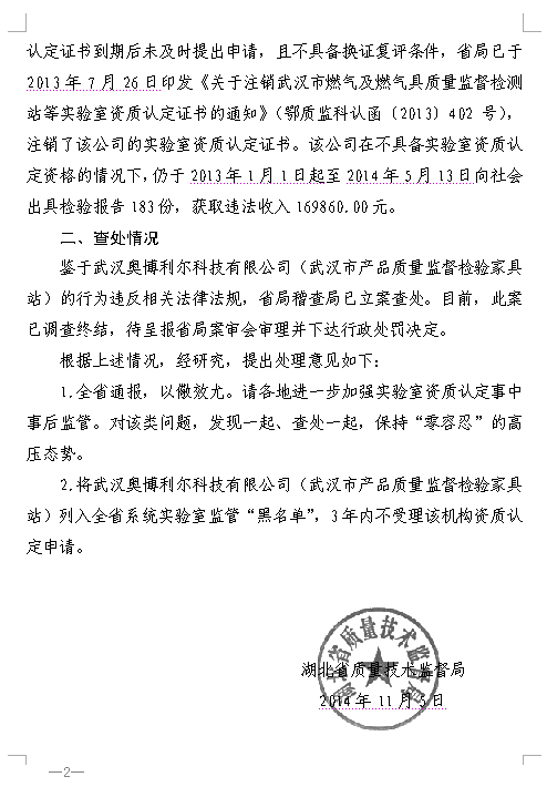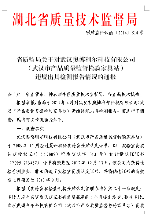 经查,武汉市奥博利尔科技有限公司也就是武汉市产品质量监督检验家具站,2009年拥有了检测家具资格,获得实验室资质认定证书和计量认定证书。2012年底证书过期后,湖北省质监局注销了该机构的检测资质,该机构却伪造证书,直到2014年5月,仍在对外出具检测报告,并获得违法收入16万多元。湖北省质监局将该公司纳入质监系统的“黑名单”,3年内不再受理该机构的资质认定申请。